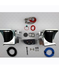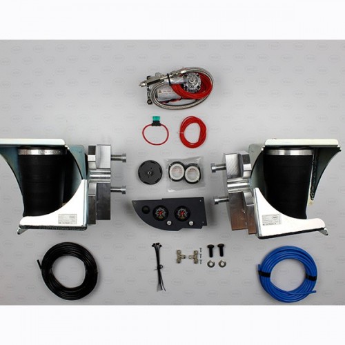 Kit composto da 2 soffietti in gomma telata con staffe di fissaggio, compressore e pannello a doppio manometro specifico per il veicolo.